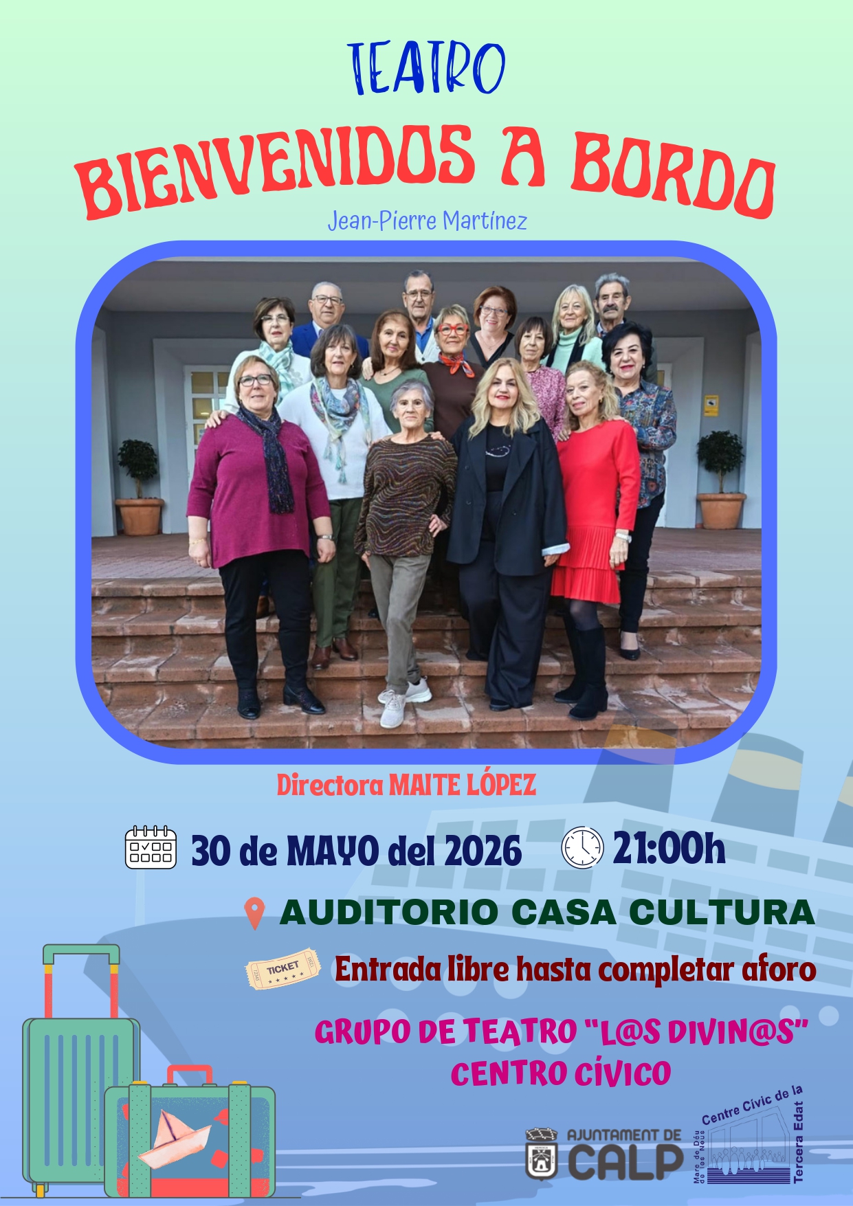 Group "L@s Divin@s" - Director Maite López Category Theatre Date Sat, 30/05/2026 Schedules 21:00h Price Free admission until capacity is reached Place Auditorium, House of Culture Organize Ajuntament Calp + Civic Center for the Elderly Related events DAFÓ THEATRUM presenta “CELLER ROMÁN” 18/04/2026